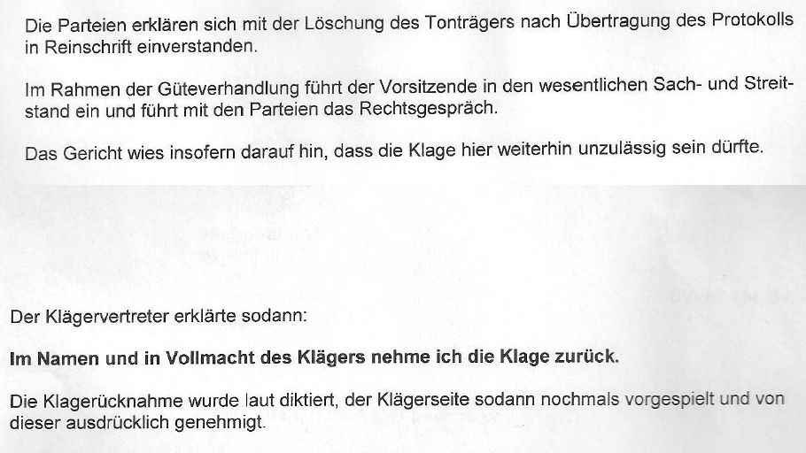 Ein Vergleich wurde in der Verhandlung von der Beklagtenseite ausgeschlagen, so dass der Richter letztmals dem Anwalt des Regionalverbandes die Möglichkeit einräumte die Klage doch noch zurückzuziehen. Sollte es zu einem Urteil kommen, würden die Kosten hierfür umso höher ausfallen. Aufgrund des geringen Streitwertes wäre auch eine Berufung ausgeschlossen. Der Verbandsanwalt zog daraufhin die Klage im Namen des Regionalverbandes zurück.