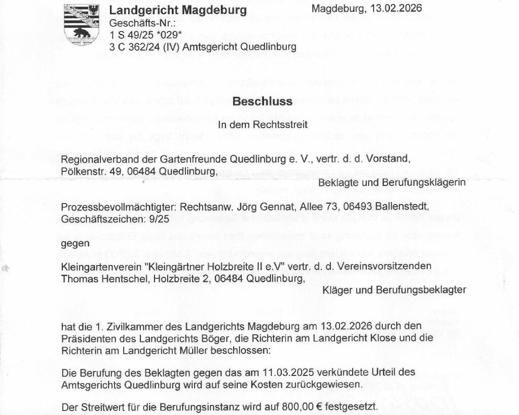 Wir blicken heute zurück auf das erstrittene Urteil der Kleingärtner Holzbreite II e.V. gegen den Regionalverband der Gartenfreunde Quedlinburg e.V. – fast ein Jahr nach der Entscheidung der ersten Instanz. Als Unterlegener vor dem Amtsgericht Quedlinburg ging der Regionalverband damals in Berufung vor dem Landgericht Magdeburg. Nun liegt die Entscheidung der zweiten Instanz vor – und sie ist eindeutig. Das Landgericht stärkt die Verbindlichkeit einer Vereinssatzung und weist die Berufung zurück. Die Richter sprechen von „keiner Aussicht auf Erfolg“.